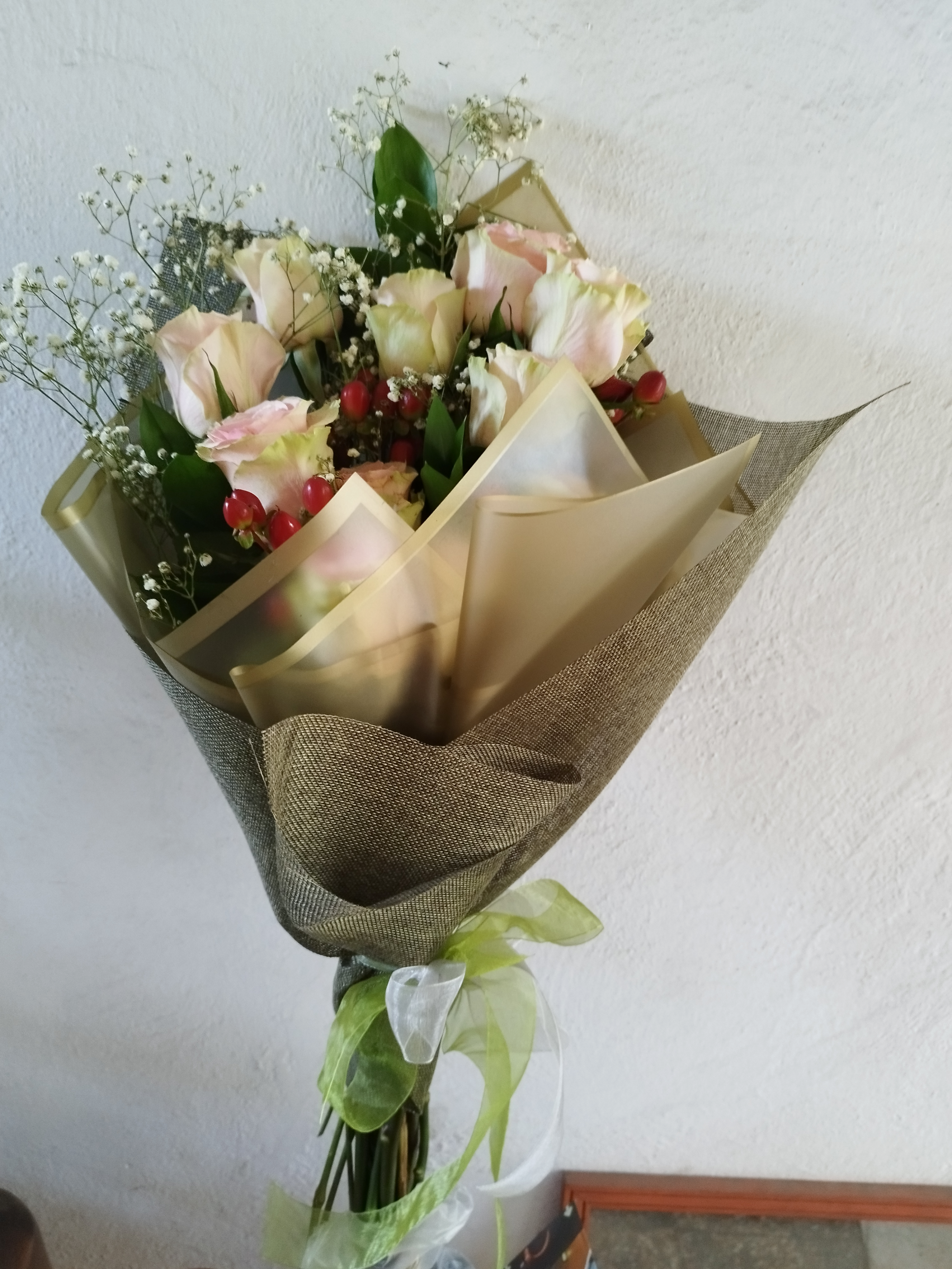 Ramo con 9 rosas ecuatorianas, hipericum y gypsophilia envuelto en papel de seda y arpillera